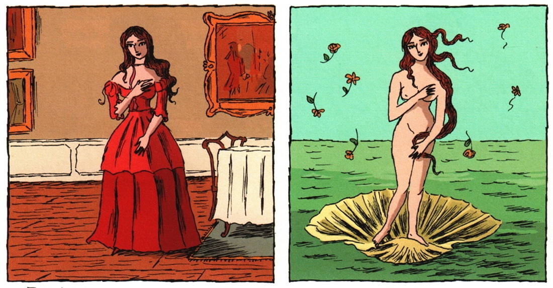 Sandro Botticelli, Narodziny Wenus (Nascita di Venere), ok. 1485.„Captain Marvel”, nr 27, 1973, scen. Jim Starlin i Mike Friedrich, rys. Jim Starlin, tusz Pablo Marcos.